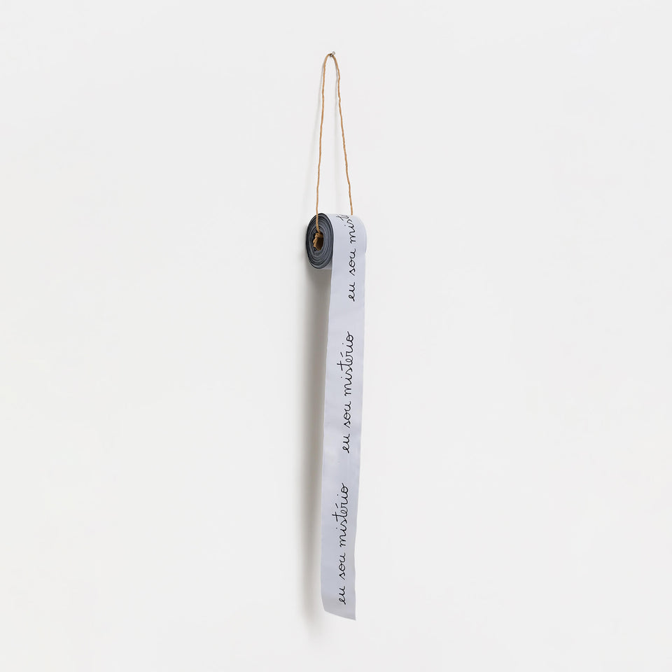 The "I am mystery" edition was developed by the artist in 2020 and consists of a 12-meter roll of fabric label. It is an edition that can be displayed as an object on the wall or become interactive, being cut into pieces and distributed.