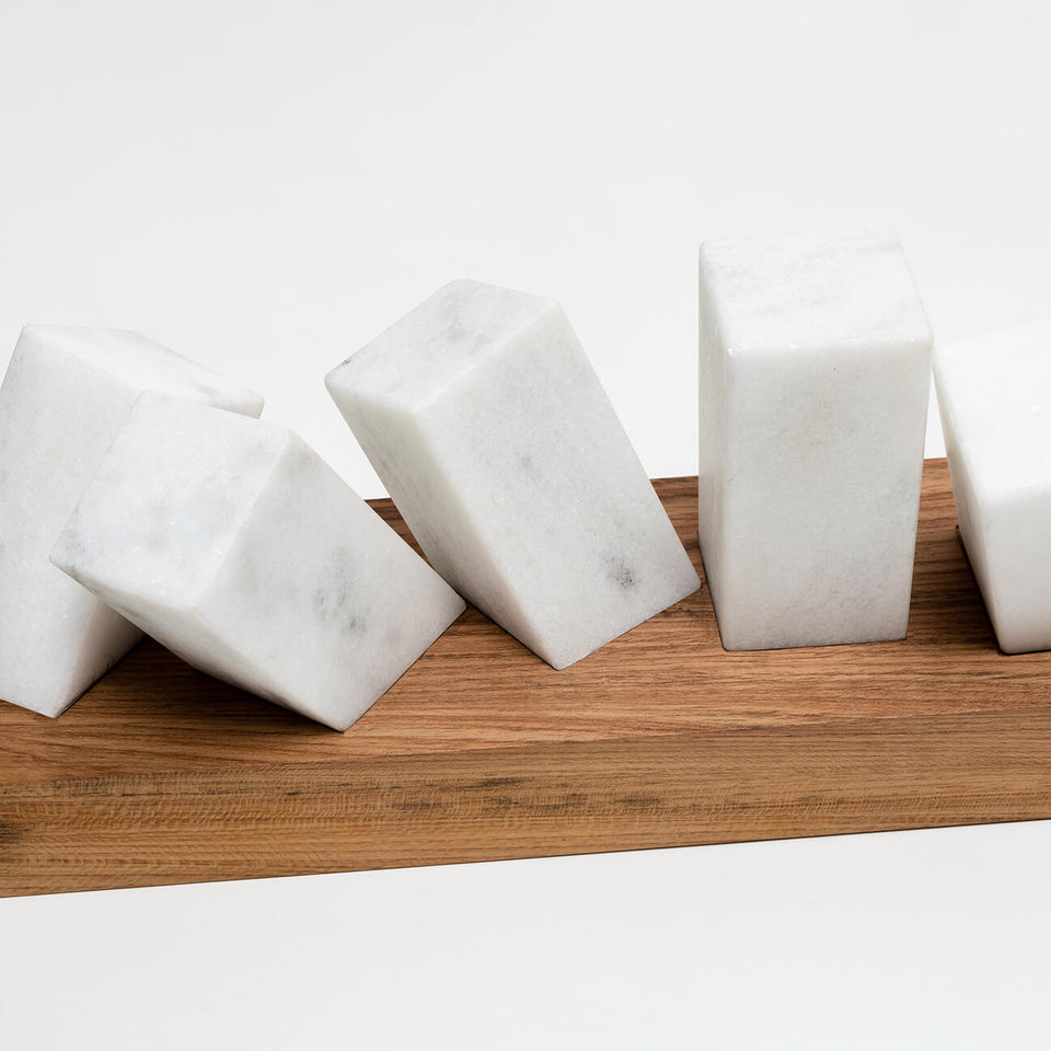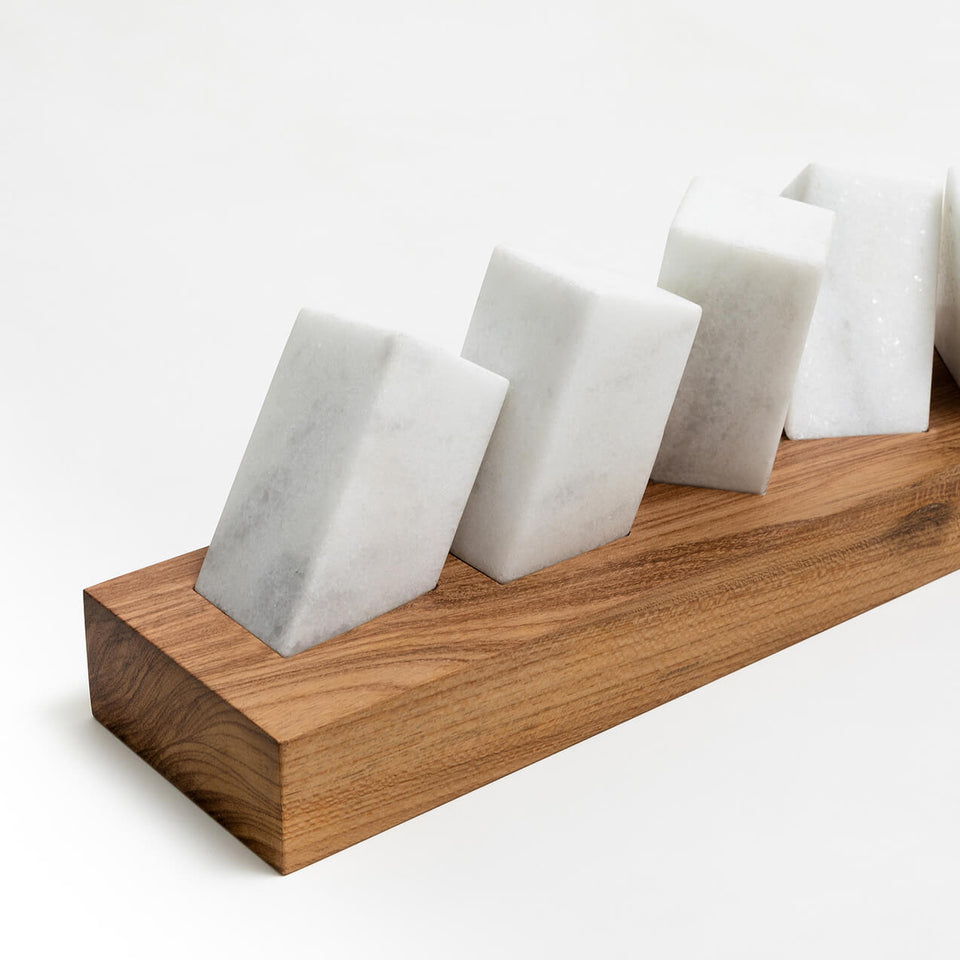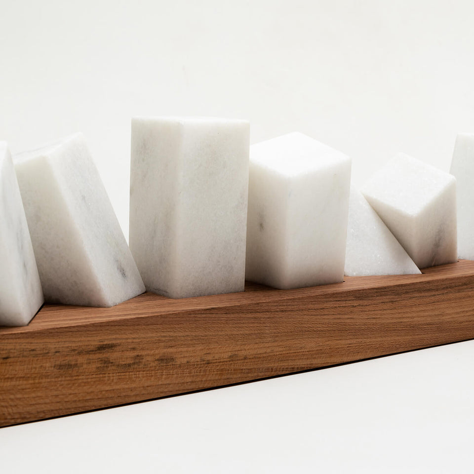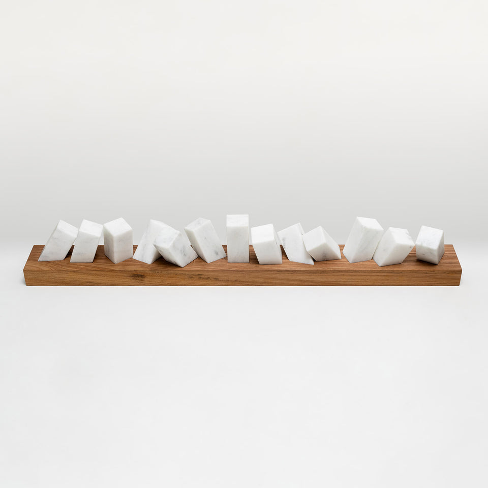 "Koinonía" is composed of 13 pieces of white marble whose inclinations are taken from the figures of Leonardo Da Vinci's "Last Supper".