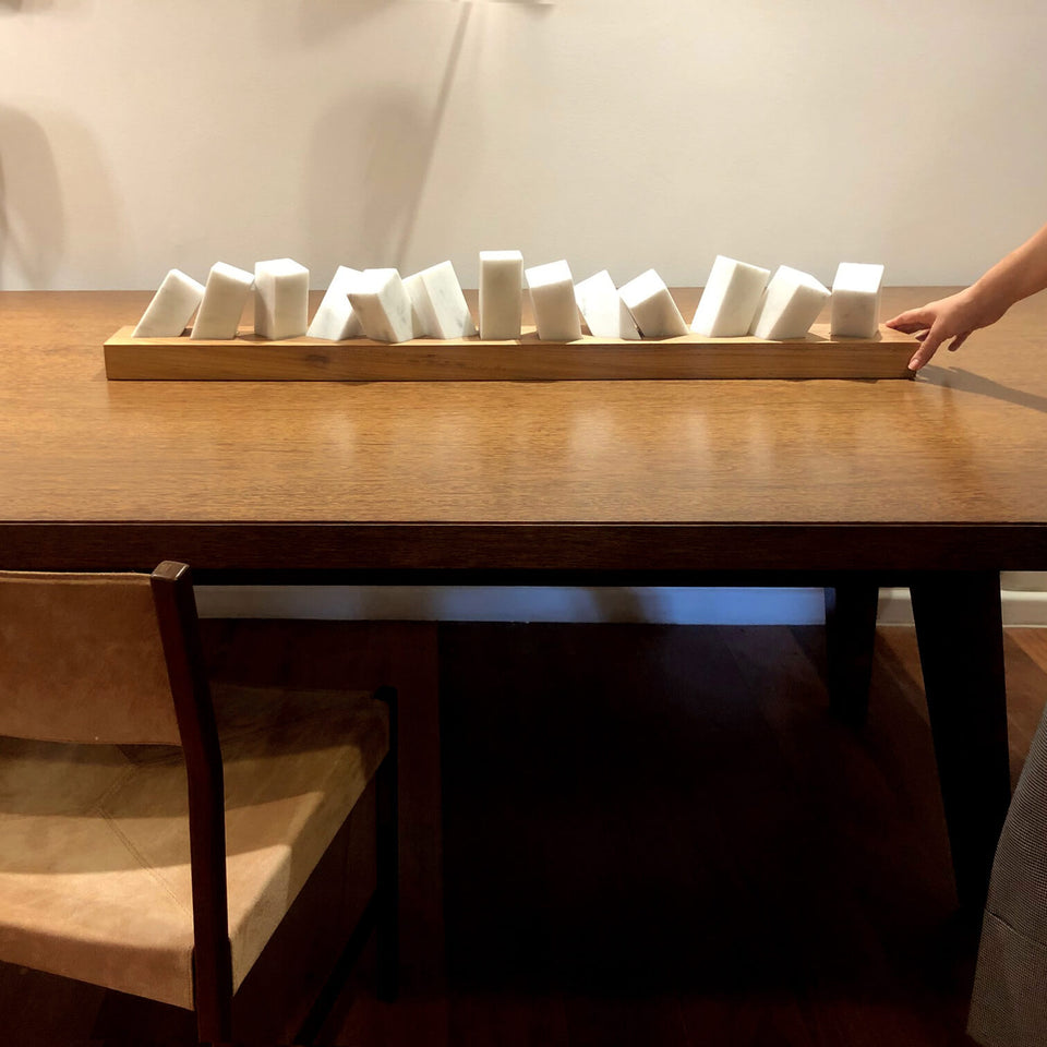 The studies that were done showed that, three-dimensionally, the pieces would not be supported on their own axis of balance, which caused some of them to rotate, creating mutual support between the pieces. This support made me think of help and support, hence the Greek title koinonia, which in Portuguese means communion. Sharing the effort of each one to build for all. An ideal, certainly impossible, but which can exist as a goal to be pursued.